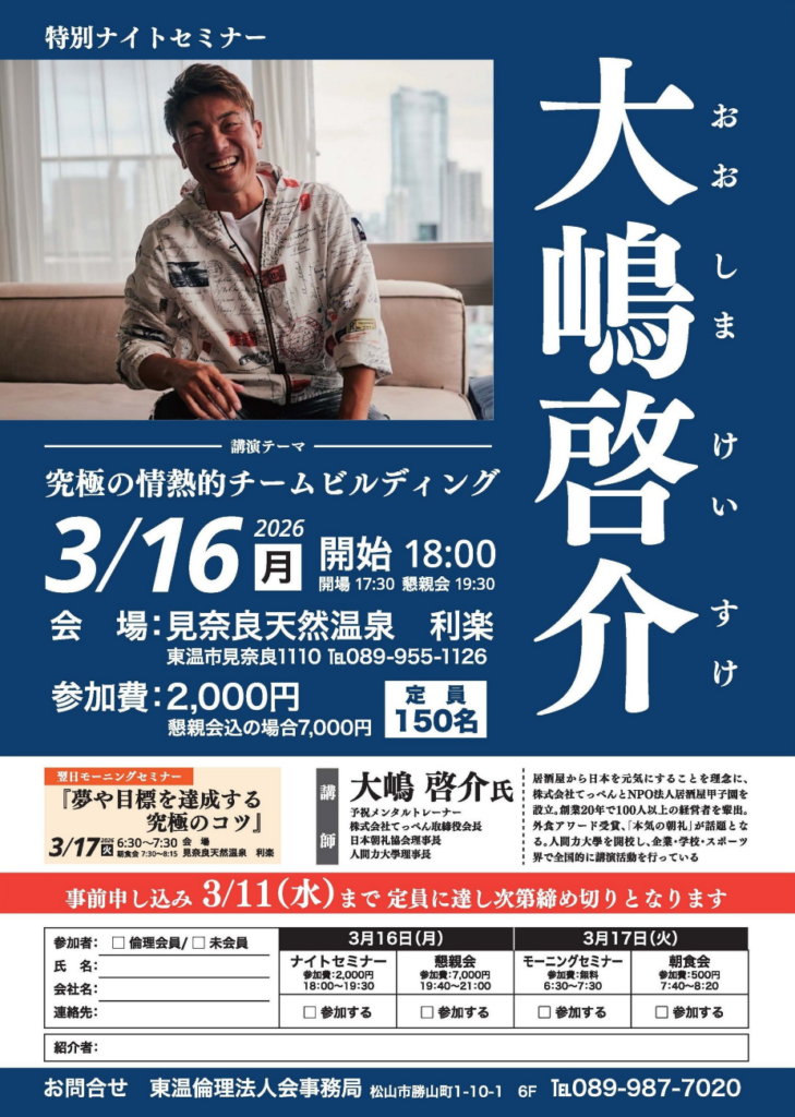 ※予約必須※ 3月16日(月)大嶋啓介さんをお呼びして特別ナイトセミナーやります♪