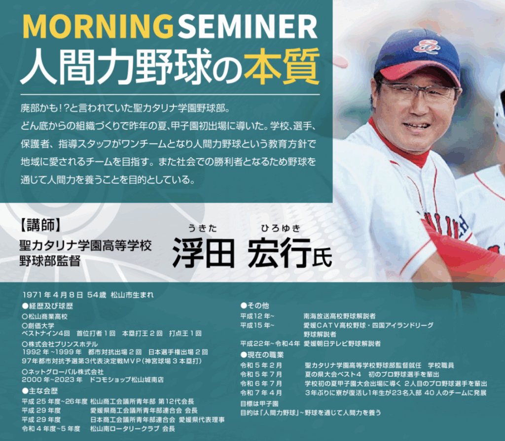 どん底からの組織づくりで昨年の夏、甲子園初出場に導いた。学校、選手、保護者、指導スタッフがワンチームとなり人間力野球という教育方針で地域に愛されるチームを目指す。また社会での勝利者となるため野球を通じて人間力を養うことを目的としている。