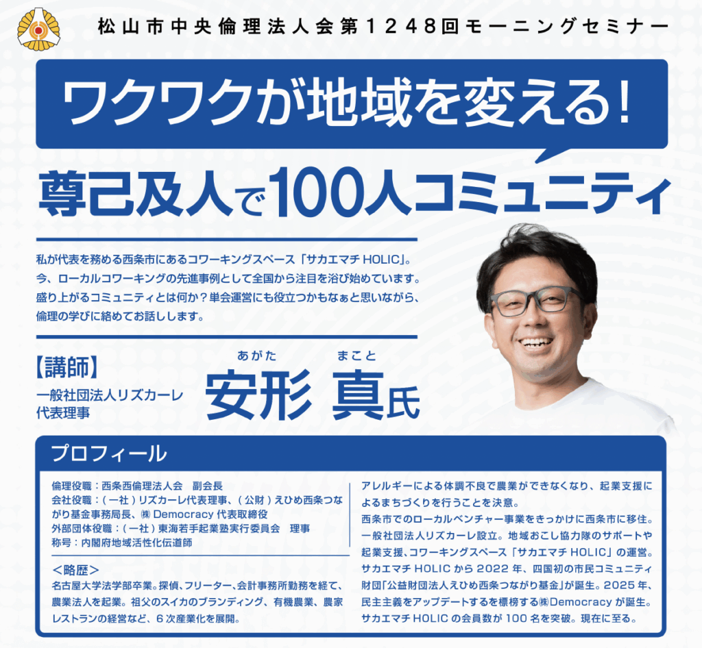 会社役職:(一社)リズカーレ代表理事、(公財)えひめ西条つながり基金事務局長、(株)Democracy 代表取締役