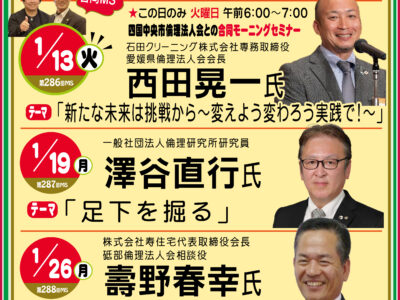 四国中央市宇摩倫理法人会1月モーニングセミナーのご案内 1月13日の火曜日は四国中央市倫理法人会との合同MSです! 合同MSは西田晃一県会長…