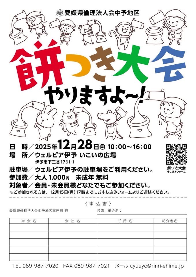 いつも愛媛県倫理法人会中予地区の活動にご理解とご協力をいただき、ありがとうございます。 さて、2025年の締めくくりとして、賑やかに「餅つき大会」を開催いたします!