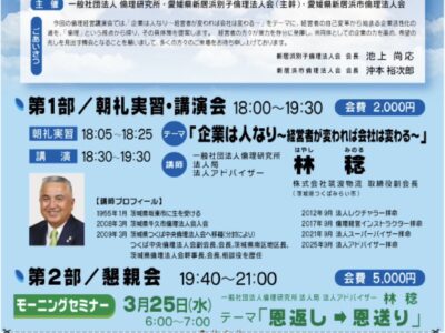 講師:田畑 章 氏一 般 社 団 法 人 倫 理 研 究 所 監 事ゴイク電池(株)代表取締役日時:3/13(金)6:30〜7:30開演 創…